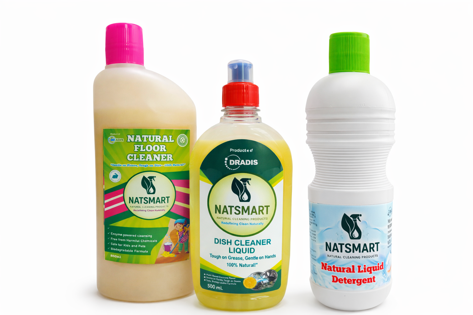 Designed for homes that believe cleanliness should be both powerful and pure, the NatSmart Trio unites our Floor Cleaner, Dish Cleaner, and Laundry Detergent into one seamless, eco-conscious collection.